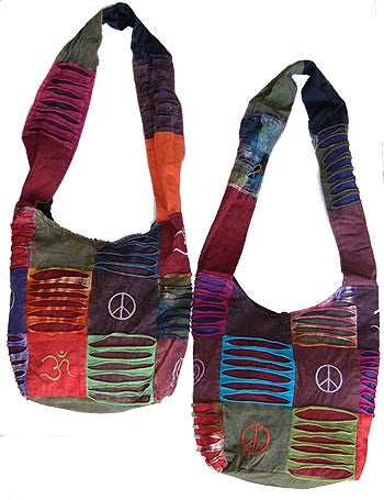 Hippie clothes. Bohemian clothing. Handmade in Nepal! 100% cotton patchwork no-match Hobo shoulder bag. This bag is decorated with lots of embroidery and other fun embellishments. Four inch gusset, zipper closure, stash pocket with velcro closure on strap which is great for storing keys!. The body of the bag measures 15" x 14" x 4" and the strap is 20" long from the top of the bag to the top of the strap, or 40 inches total.The bag is worn over the shoulder and falls about hip length on the average person. The back of the bag is plain. All bags have peace signs but the fabric swatches are different on each bag.A great addition to any bohemian hippie wardrobe. Check the measurements below.